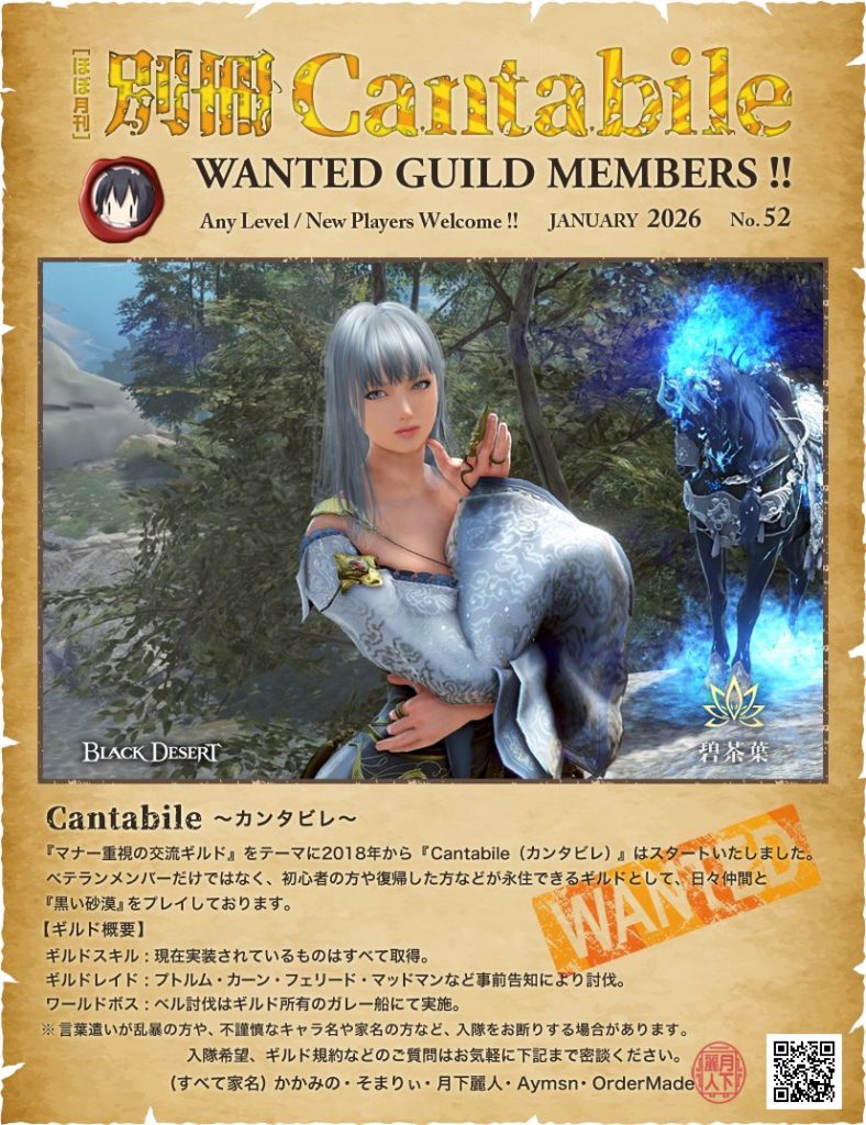 『Cantabile(カンタビレ)』意味は音楽用語で「歌うように」 黒い砂漠の広大な世界を「歌うように」メンバーと冒険するために ゲーム内チャットのみを利用しマナーある方のみで構成されたギルドです。年齢、性別を問わず、さまざまなプレイヤーが在籍しております。初心者のかたやベテランの方まで幅広くプレイしています。また、アクティブメンバーが多いため、夜間のゴールデンタイム(20時~0時)以外にも、早朝や深夜など24時間どの時間帯にもメンバーがプレイしています。